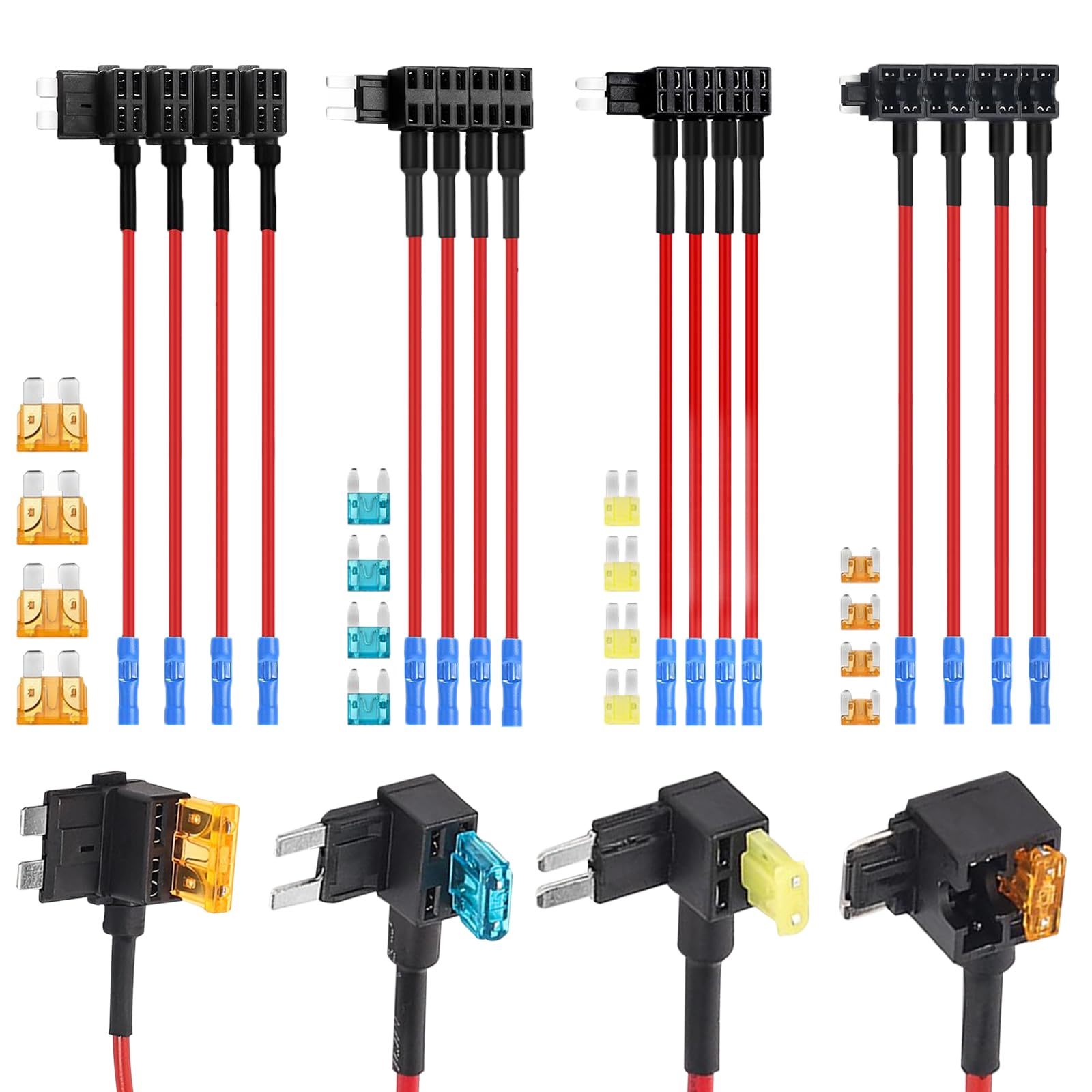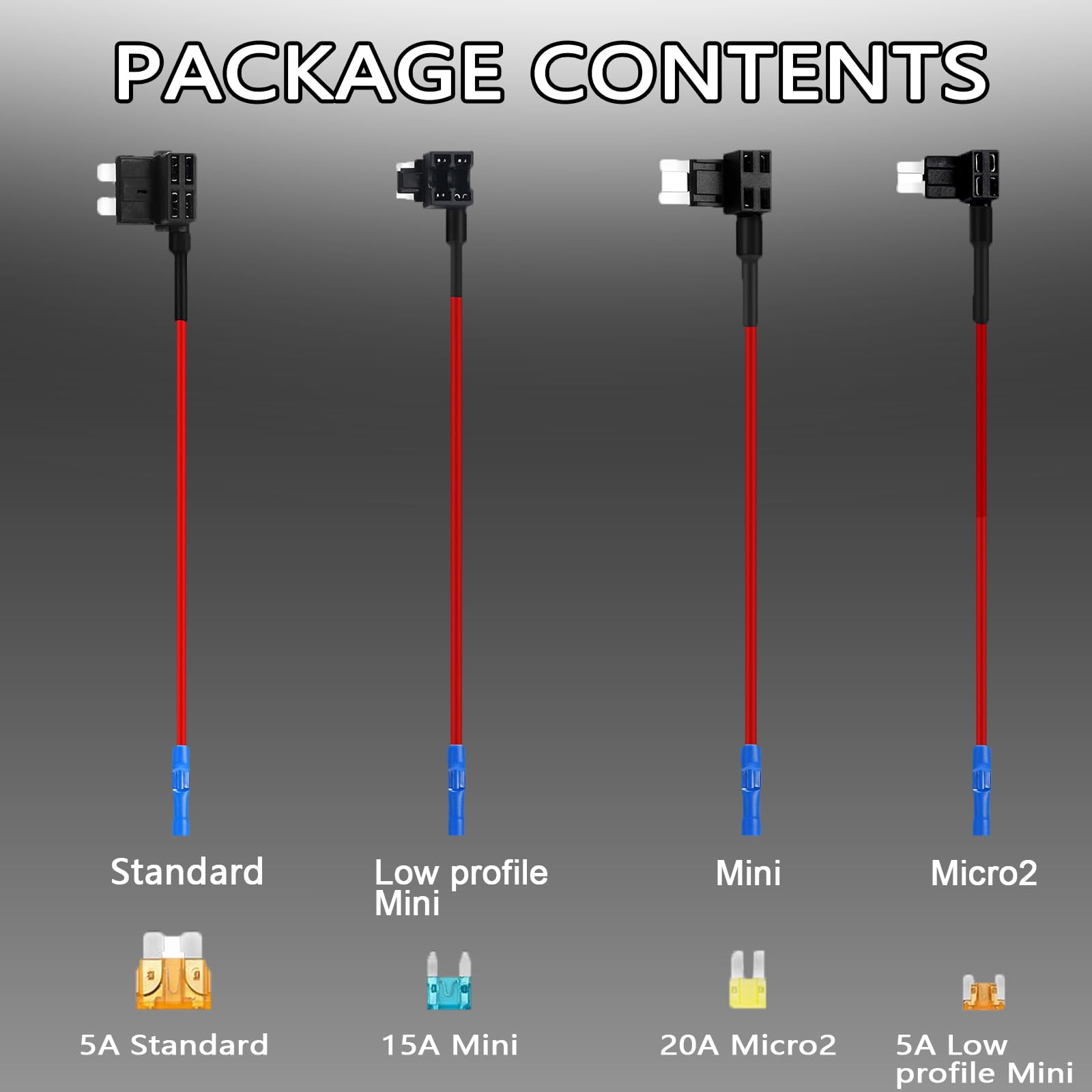 - Package Contents: 4 types of fuse tap kit, including 4 low profile mini fuse taps, 4 mini fuse taps, 4 micro2 fuse taps, 4 standard fuse taps, 16 blade fuses