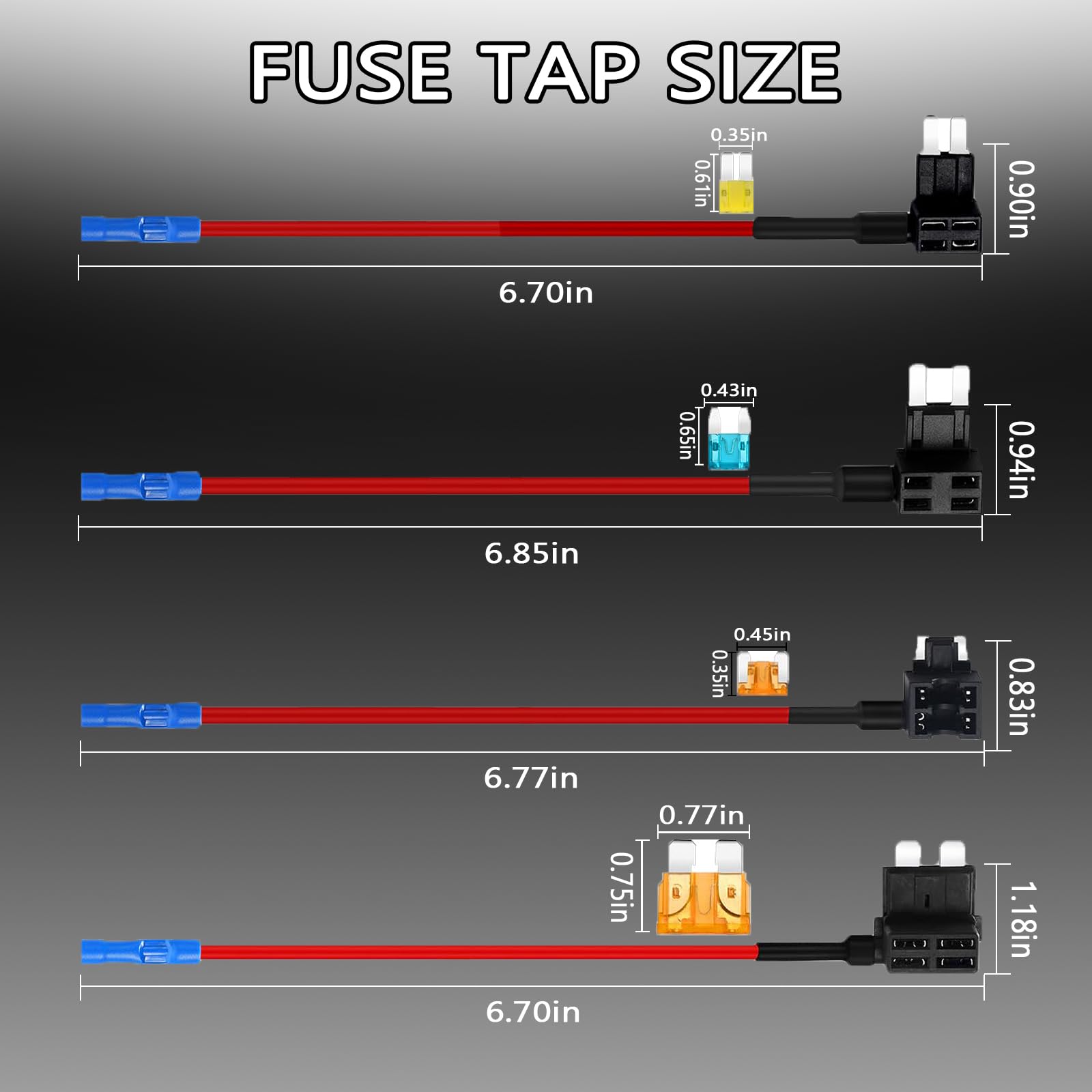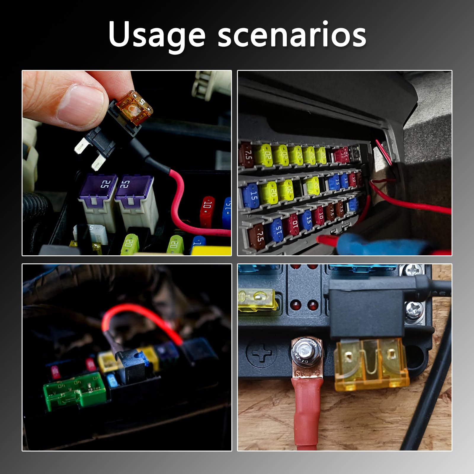 - Strong Compatibility: Suitable for cars, trucks, camper RVs, motorcycles, boats and most general DC applications, etc., covering components such as radios, lights, etc. Use when hardwiring or adding LED light strips, dash cams, or other electronic devices that need to be wired directly to the fuse box