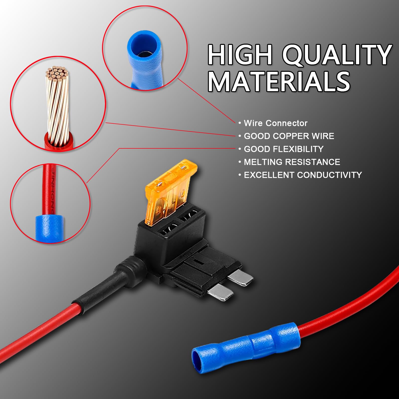 - High-quality Materials: The 16AWG wire leads of the fuse tap are made of high-quality ABS and copper wire, with good flexibility, bending, melting resistance and excellent conductivity