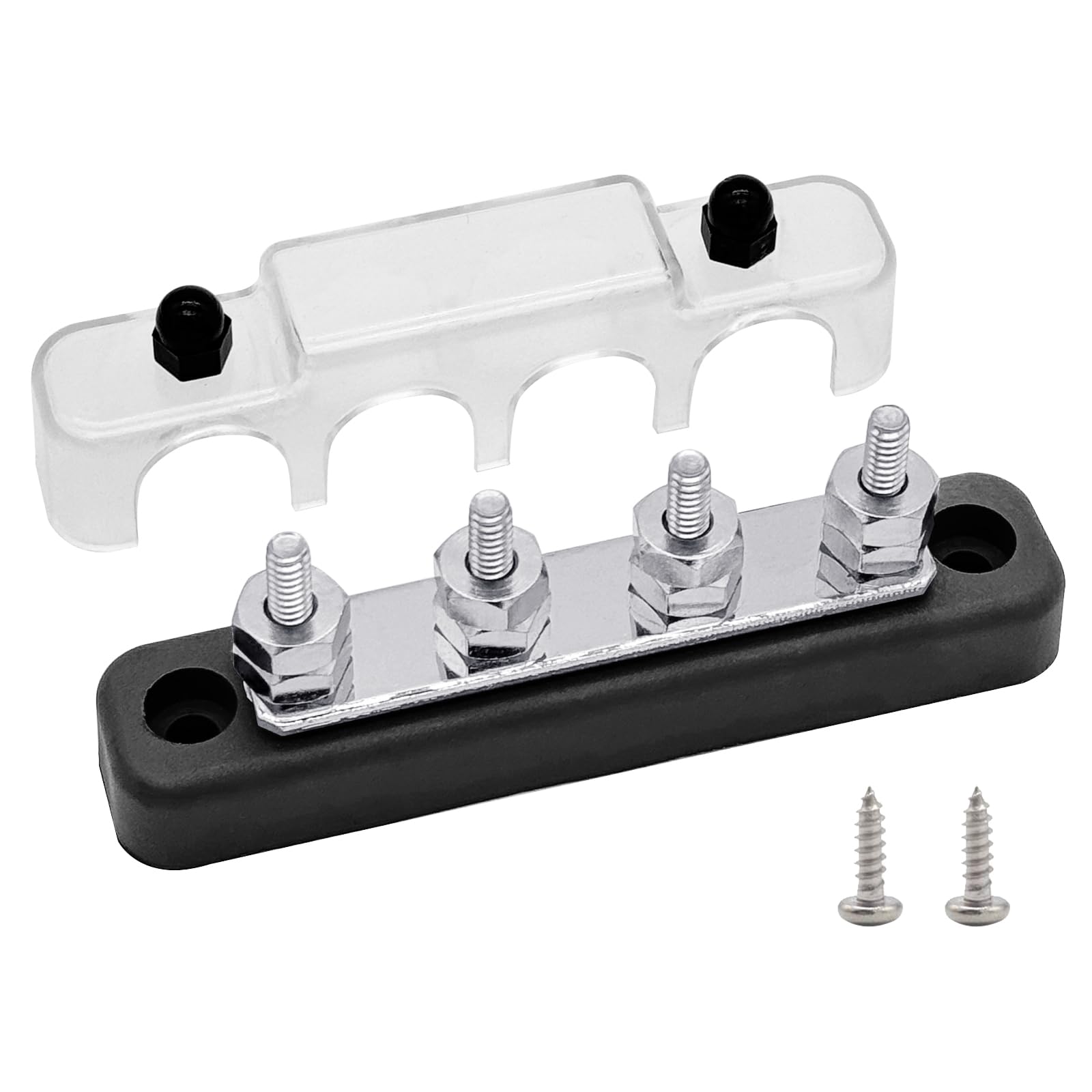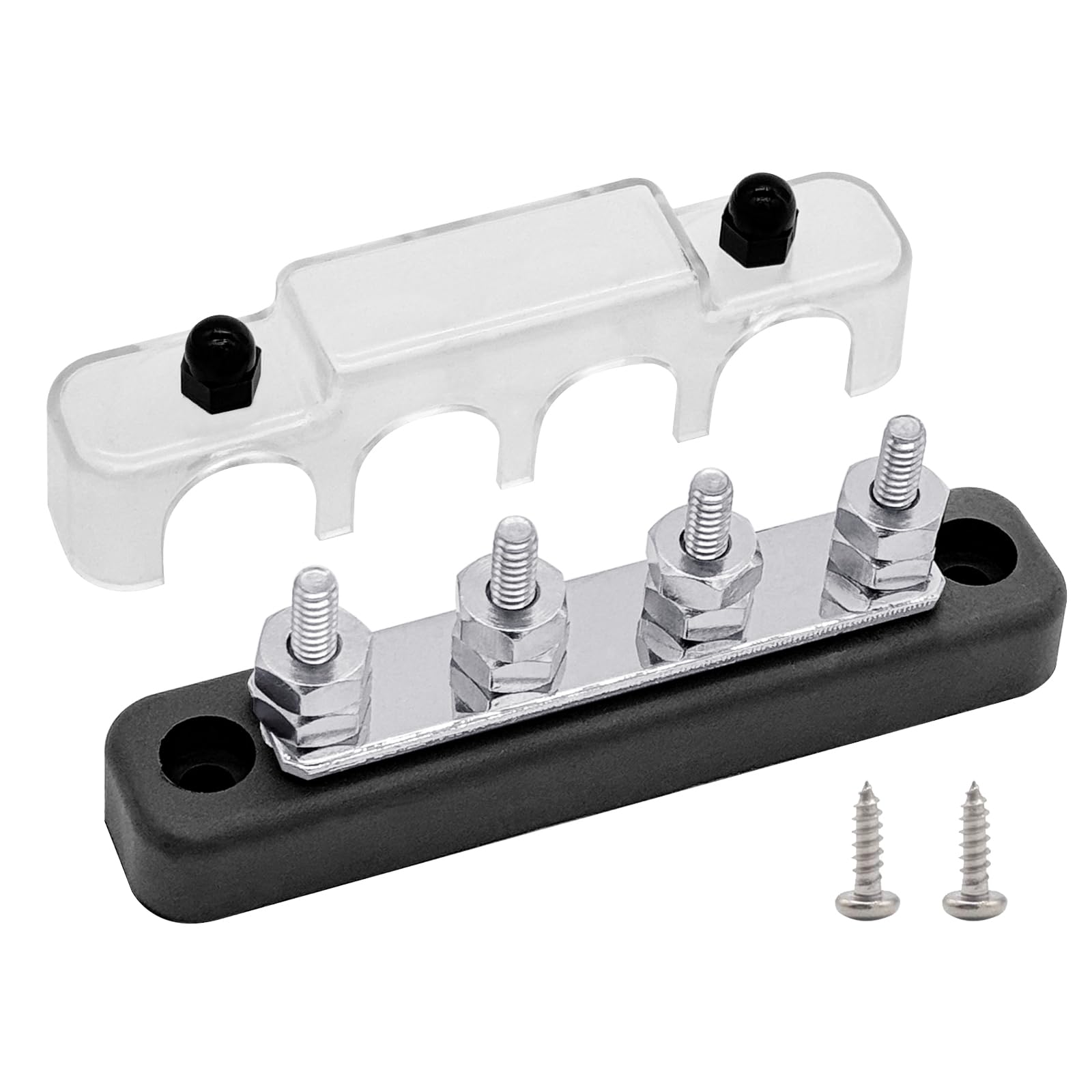 4 x #10 (M5) Studs Bus Bar, Ampper 4.2" Ground Distribution Block Brass Battery BusBar Junction with Cover for Auto Boat Amplifier and More (Black)