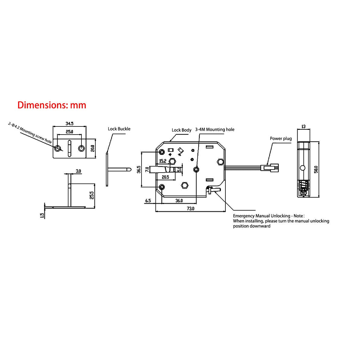 - 【SIZE】 73 * 58 * 13mm. Electrical parameters: DC12V, 2A; the duration of a single unlock signal does not exceed 0.2 seconds (to avoid electromagnet damage).