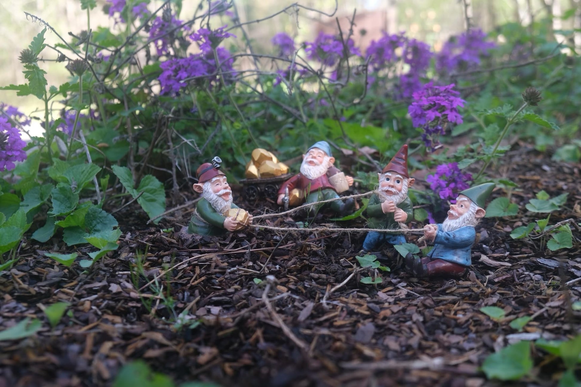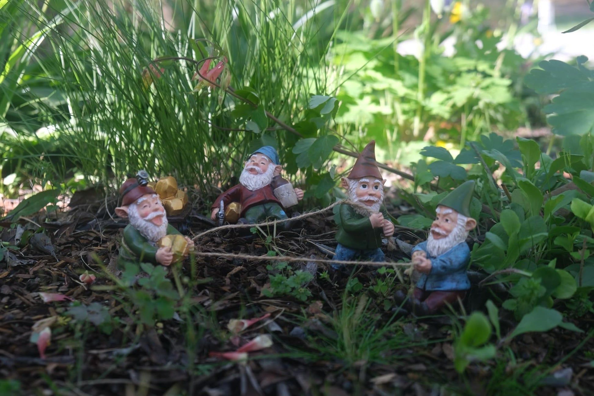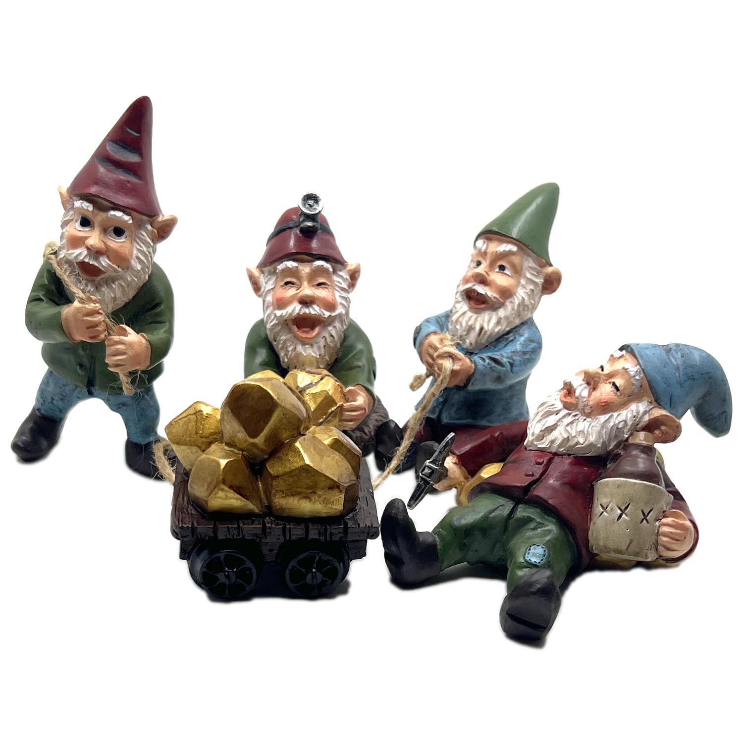 - Gnome Mining 5pc Set Expedition Set: Embark on a whimsical journey with The Gnome Creek Mining Company's delightful statue collection. This 5-piece set, approximately 3 inches tall, features four industrious gnome workers tirelessly laboring to unearth treasures at Gnome Creek. Alongside them, you'll find one gnome known for his “laid-back” attitude, with a drink in hand. Additionally, the set includes a charming cart stuffed to the brim with glittering gold, adding an extra touch of authenticity and whimsy to your garden display.