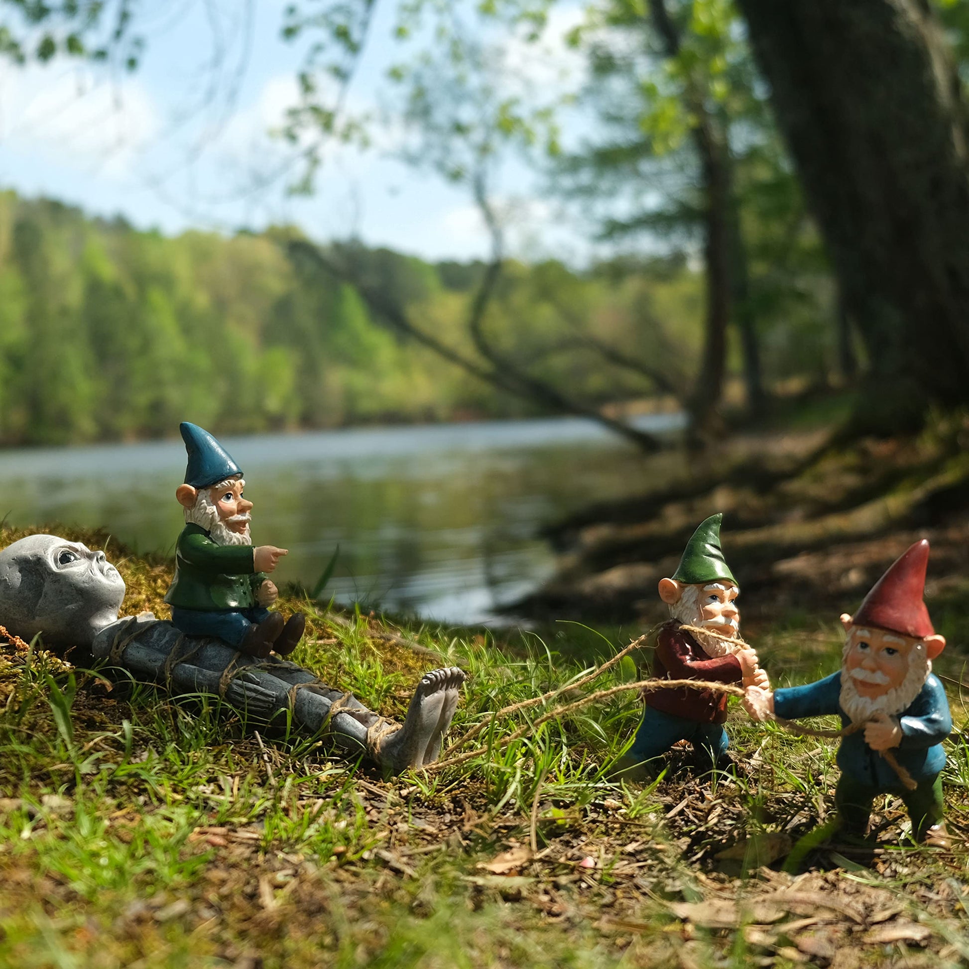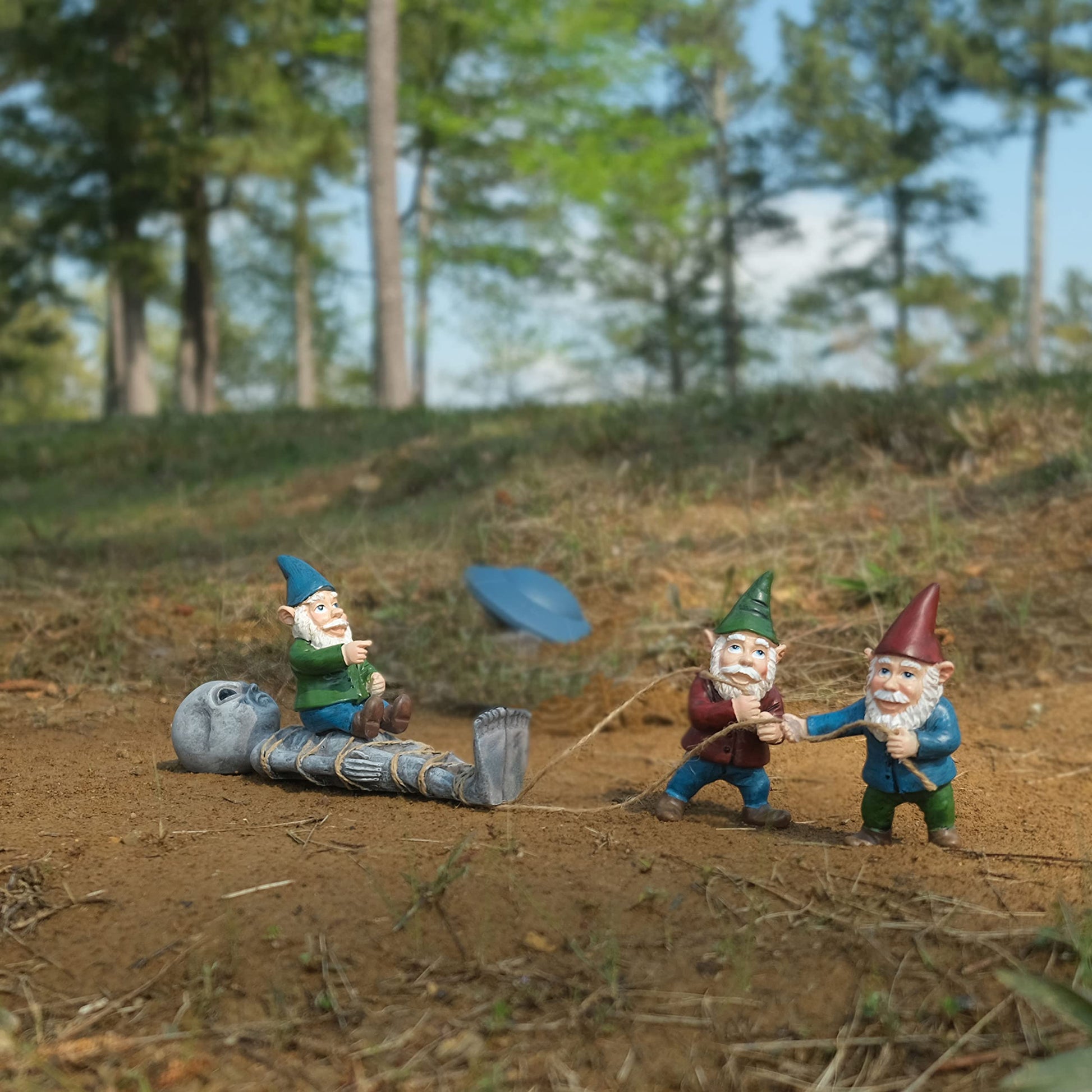 - Make your guests laugh: They may have come in peace, but these gnomes were not convinced. They quickly capture and tie up the mysterious outer space creature and drag him back home for closer observation. Delight family and friends with your funny hand painted Alien Gnome lawn decoration.