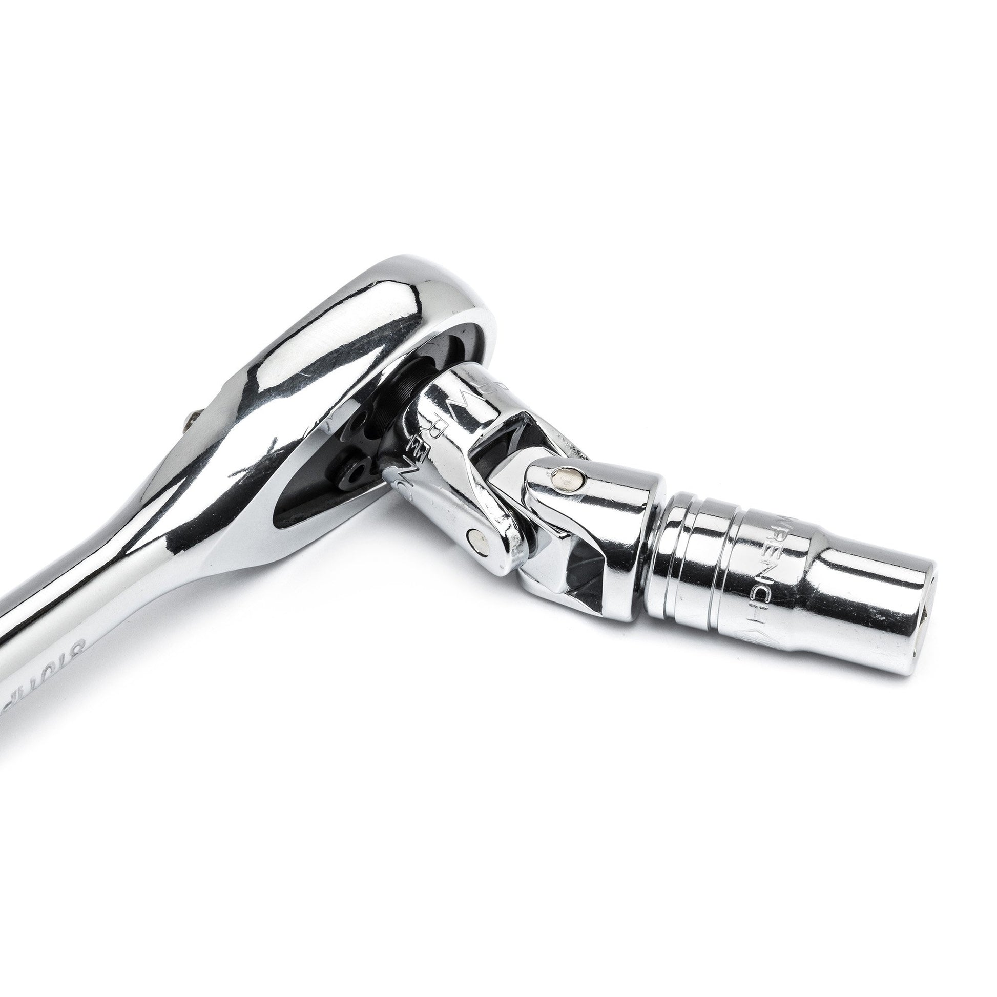 The 120XP ratchet's Double-Stacked Pawl technology provides an ultra-narrow swing arc that enables you to reach fasteners in severely limited access applications, while still delivering exceptional strength and durability. The ratchet's teardrop-shaped head has a low profile and flush mounted on/off switch, which also improves access in tight spaces. The long handle is ergonomically designed to provide comfort and a good grip, and it has an easy-to-clean, full polish chrome finish. It's all All conveniently organized in a portable and durable blow mold case with removable lid for storage in your tool chest. The 120XP ratchet makes it quick and easy to finish jobs (view larger). The 51-piece 80300P socket set (view larger). About GearWrench