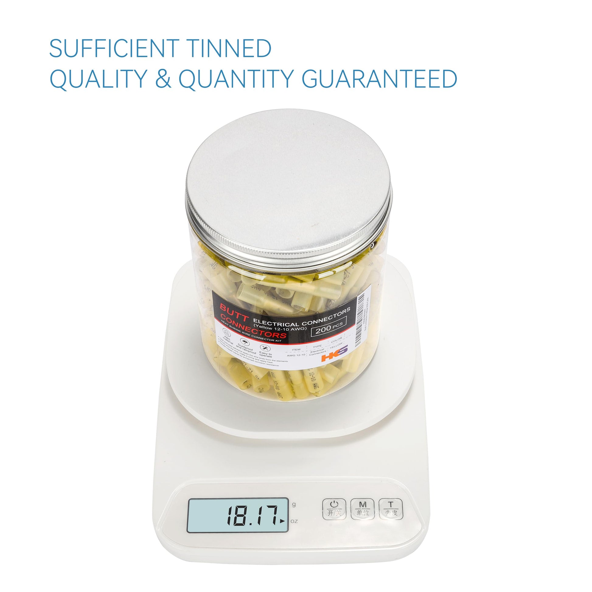 HKS 200 PCS Yellow Heat Shrink Butt Connector 12-10 AWG - Electrical Connectors - Tinned Red Copper 1mm - Automotive Marine Stereo Boat Crimp - Waterproof and Insulated