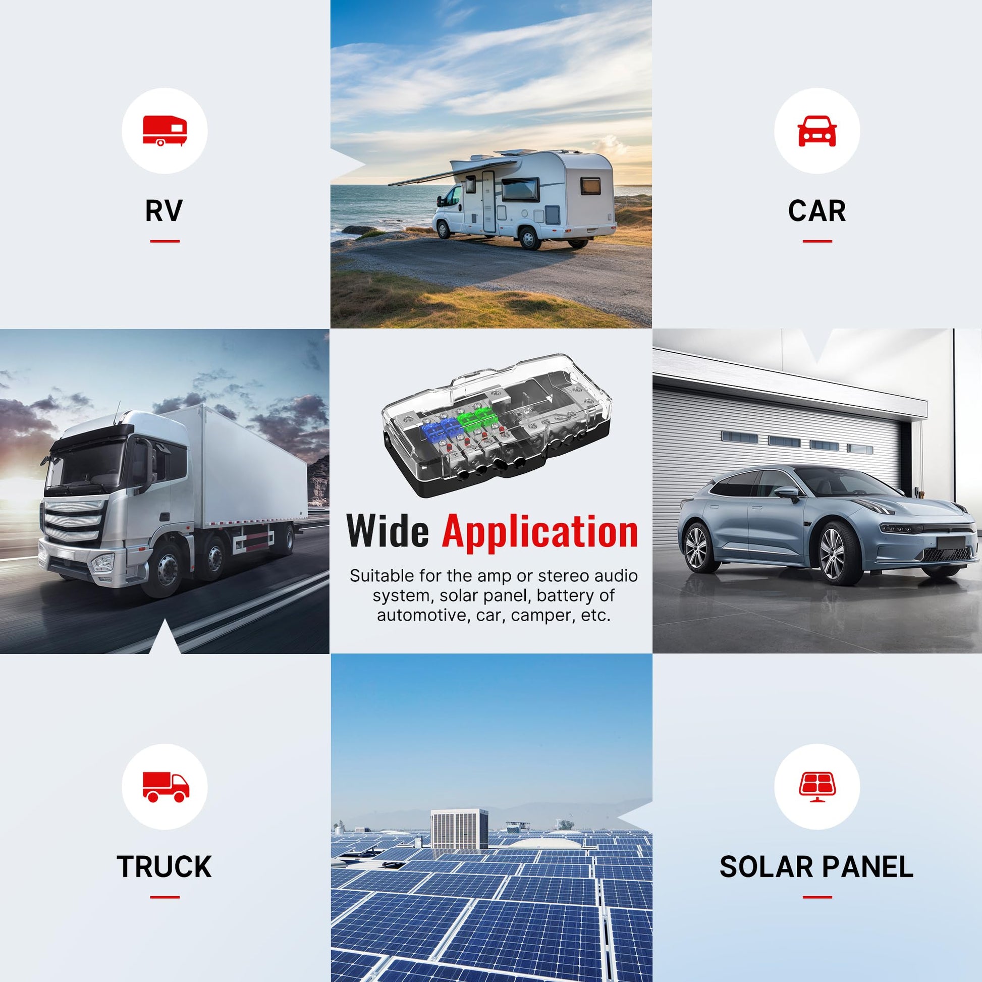 - Wide Application: The MIDI fuse box distribution block is suitable for the amp or stereo audio system, Solar Panel, Battery of automotive, car, Camper, truck, Trailer, UTV, Marine, Boat, etc