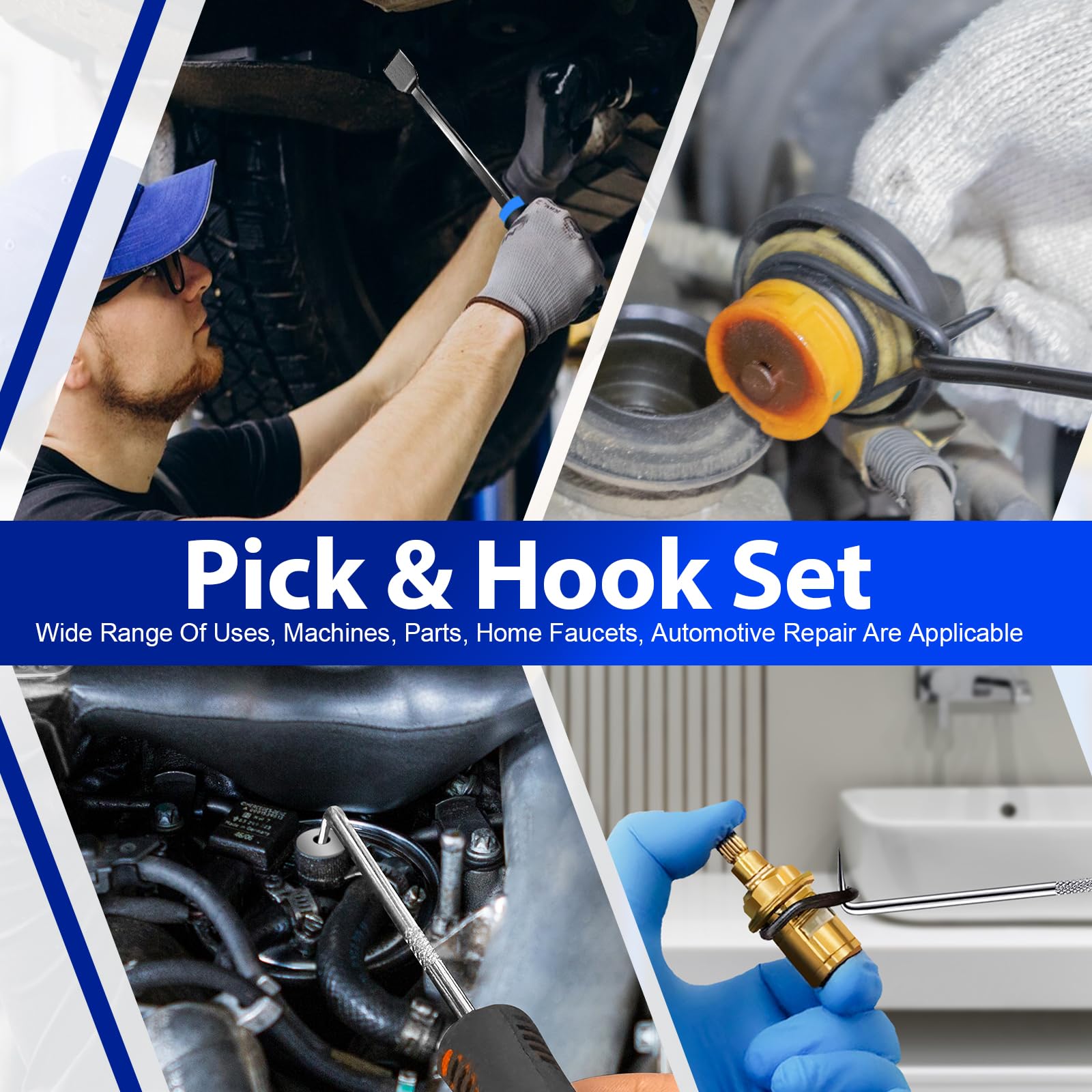 - Hook and pick tool set includes: 180 degree straight long mechanical pick, 135 degree curved hook, 45 degree hook, 90 degree right angle hook, 4 large picks (10.2 inch overall length/26 cm, shafted 6 inch), 4 mini hooks (6.5 inch overall length/16.5 cm, shafted 3 inch).great for repairing car radiator hoses, separating wires, removing small fuses, gaskets, springs, tap o-ring gasket kits,