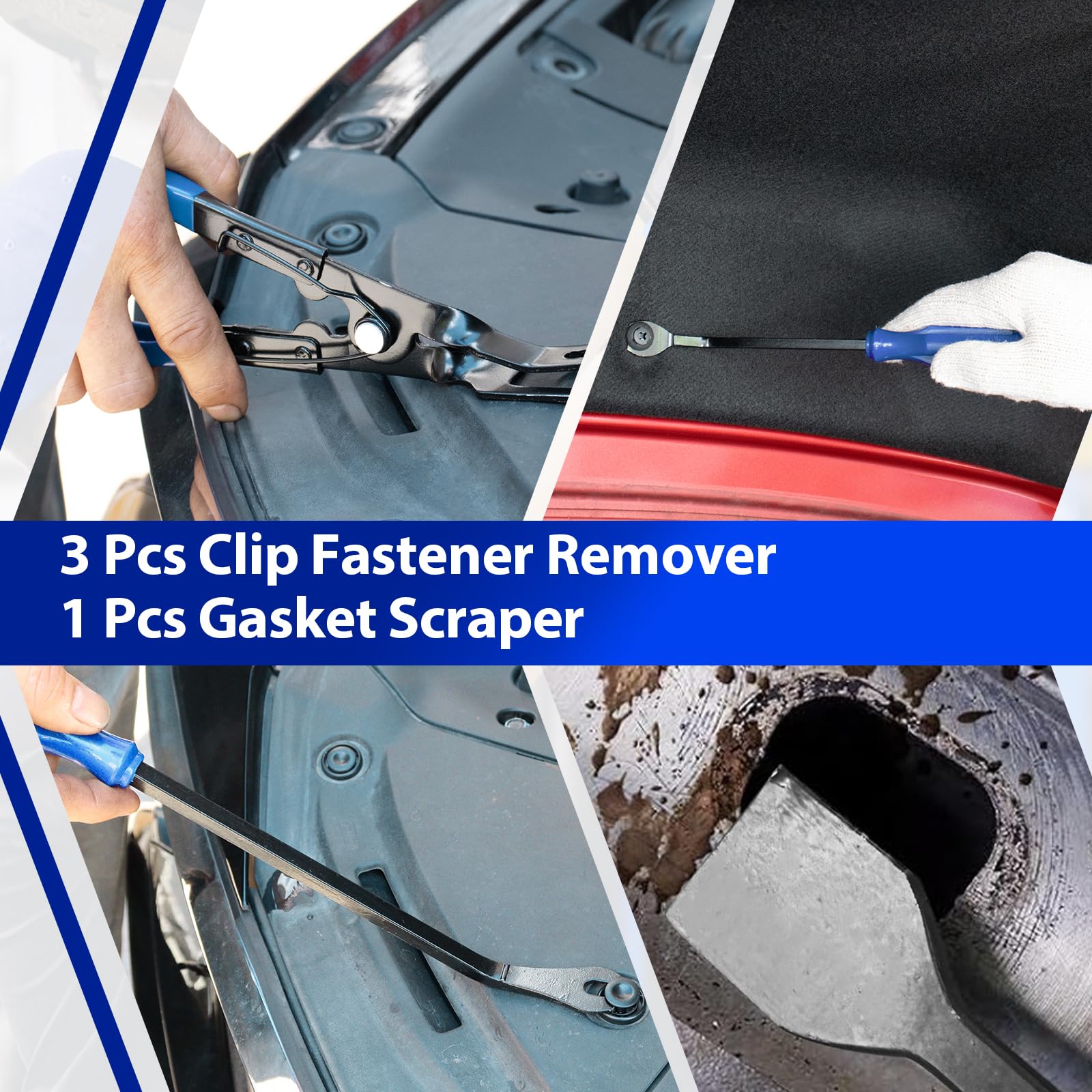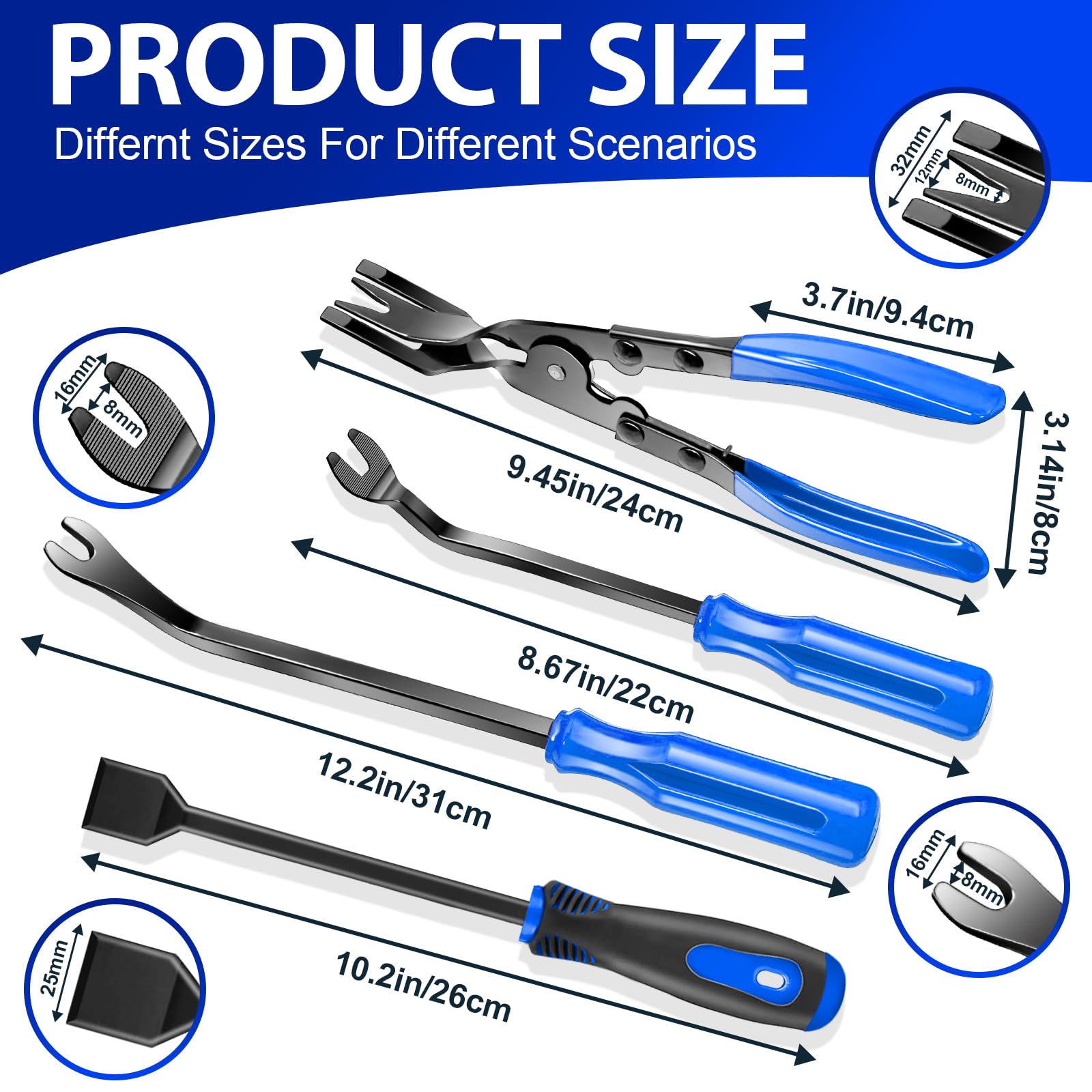 - 3 Pcs Clip Pliers fastener removers includes , 1 pcs 9.5 inch 2-in-1 clamp jaws are 1-2 mm thick and 2 pcs 8.7 inch and 12.2 inch fastener removal tools;4 pcs automotive trim removal tool is made of impact-resistant nylon fiber material, can avoid scratching your car.all applicable removing automotive push rivet fasteners from interior body trim door panels instrument panels