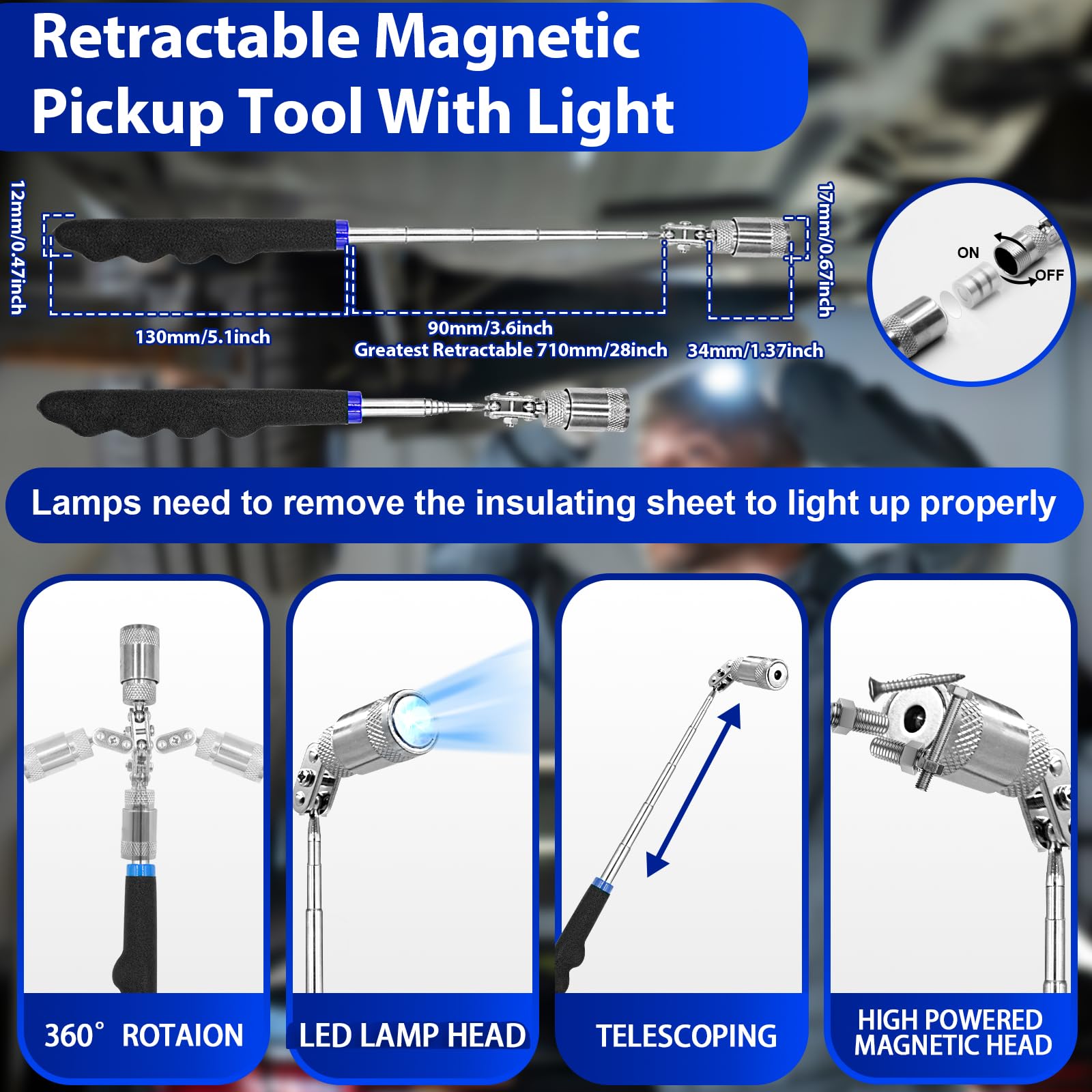 - Telescoping magnetic pickup tool:top led light simply rotates in the "no" direction to illuminate dark, tight, hard to reach places,extends from 8.7 inch/22cm to 33.1 inch/84cm,magnetic head flexes 360 degrees. easily find and grab nuts, bolts, screws and other metal parts behind appliances, cabinets, car parts, workbenches and more. useful tool for mechanics, craftsmen, firefighters, engineers, carpenters and maintenance workers